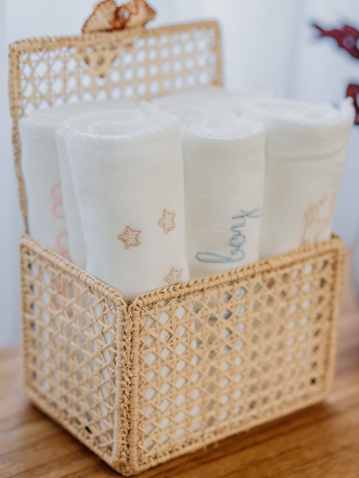 Cesto de verga com panos brancos bordados enrolados