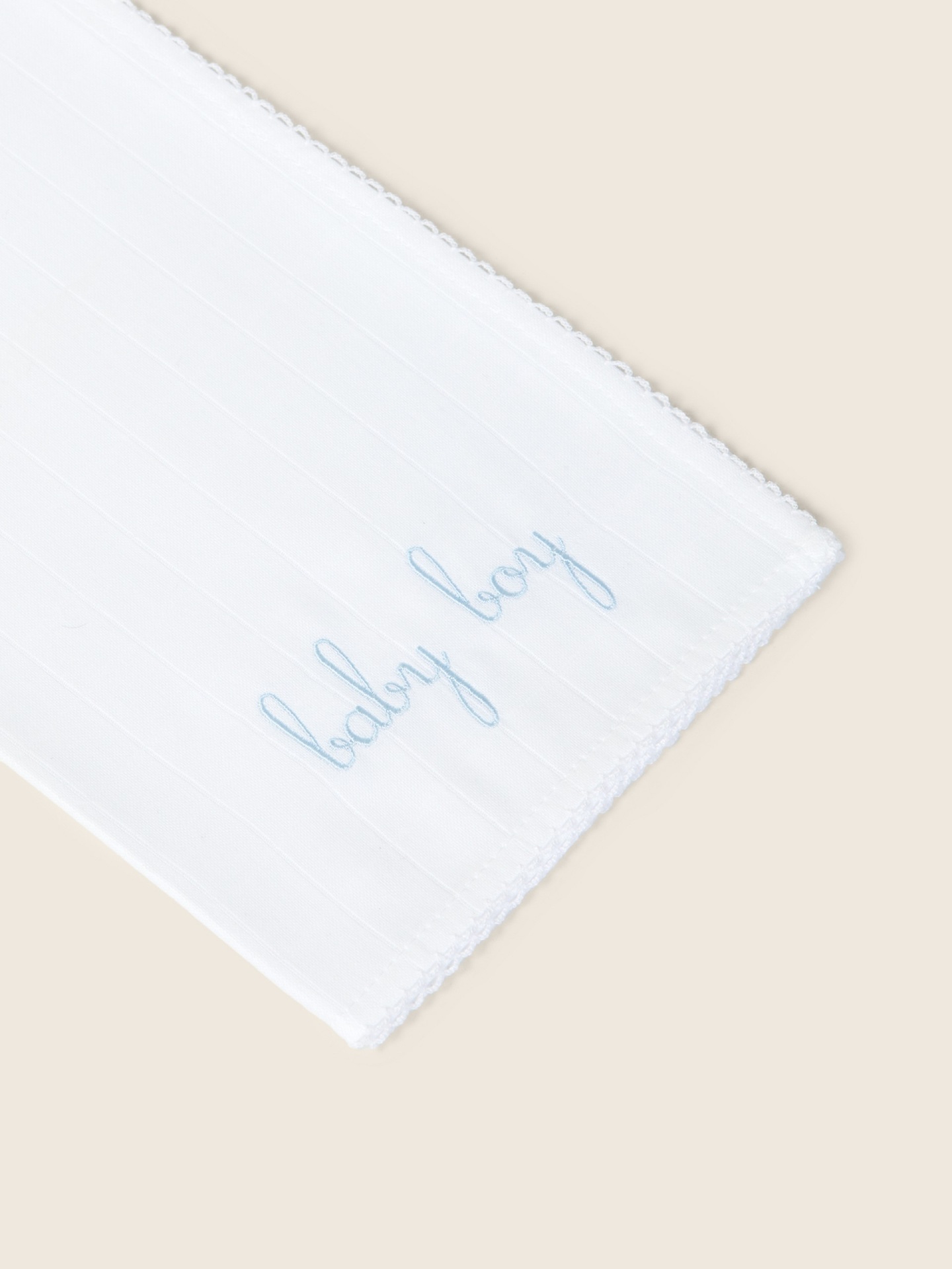 • Tecido branco listrado fino com borda decorativa e bordado azul baby boy