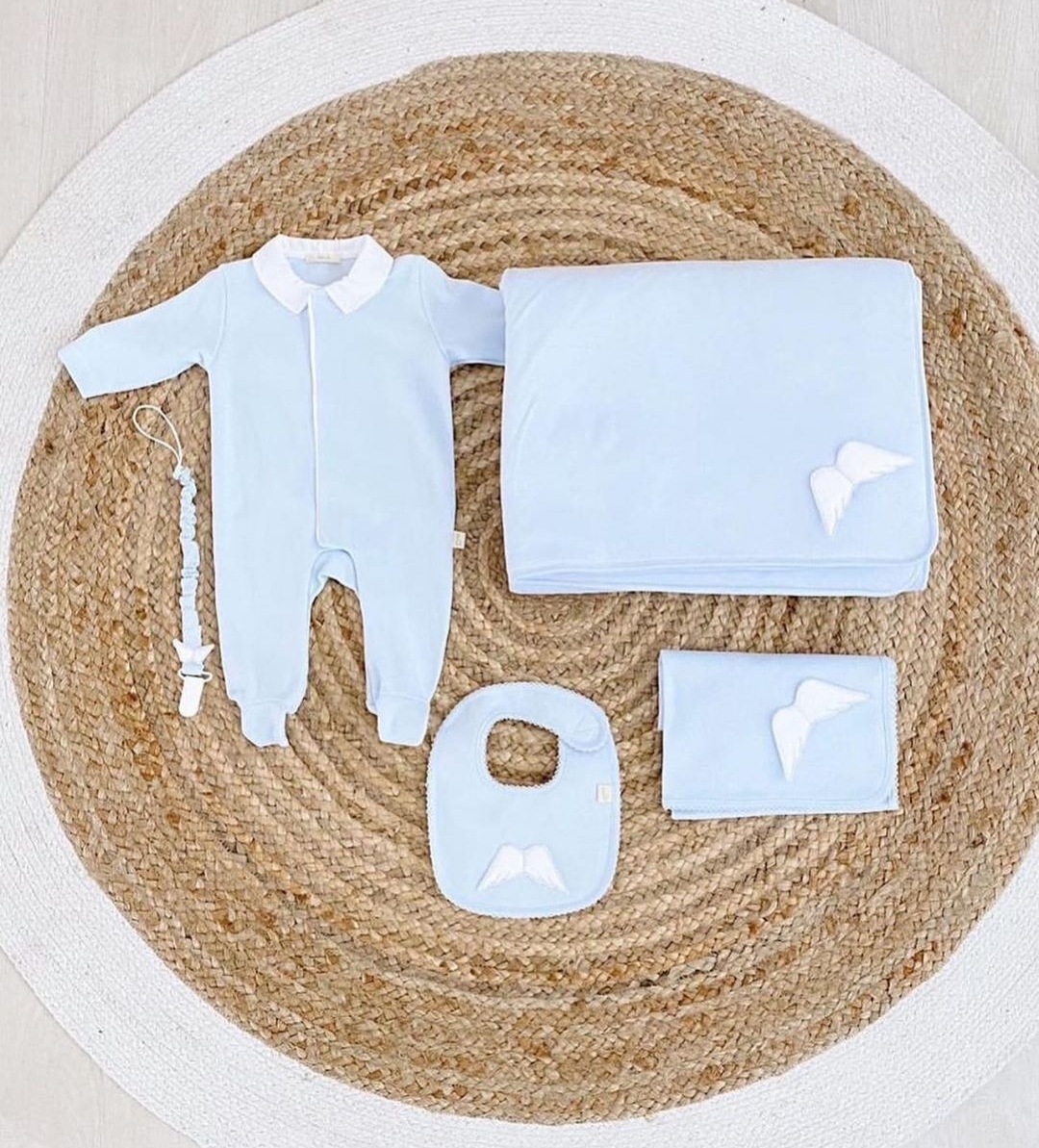 • Conjunto azul claro para bebé com asas de anjo brancas sobre tapete redondo de fibras naturais.