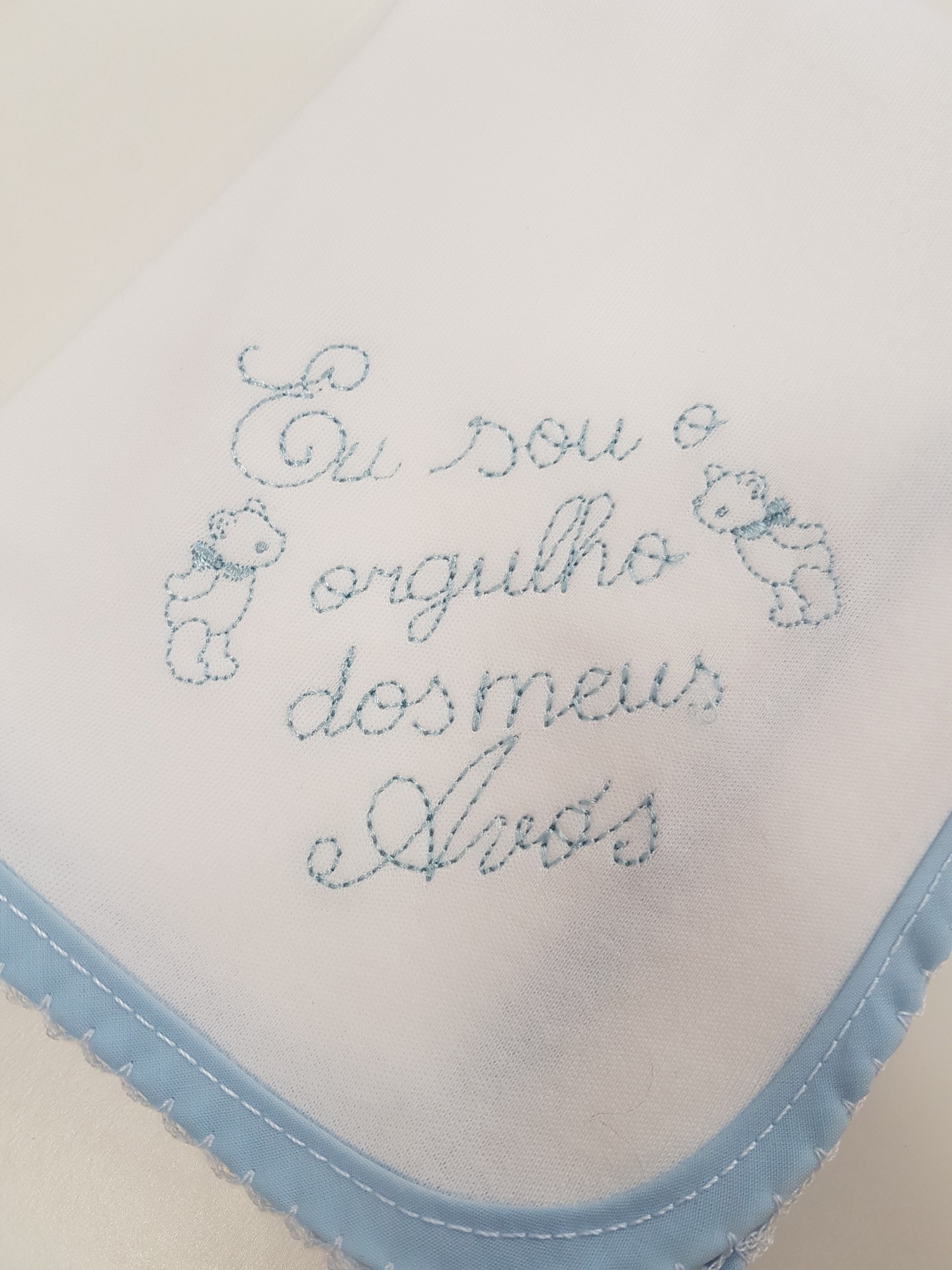 Fralda branca com fita de viés à volta de cor azul e frase bordada "sou o orgulho dos meus avós".