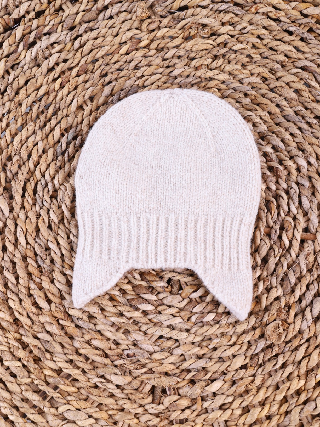 • Gorro de malha branco sobre superfície de juta trançada.