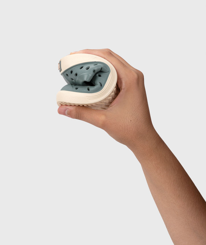 • Calçado desportivo flexível verde-azulado e bege comprimido numa mão