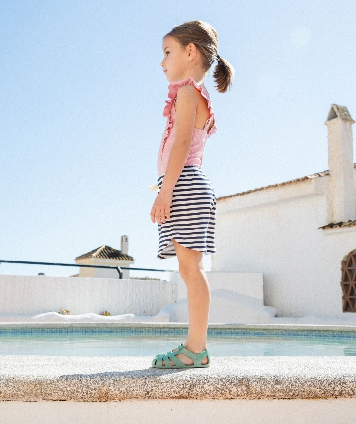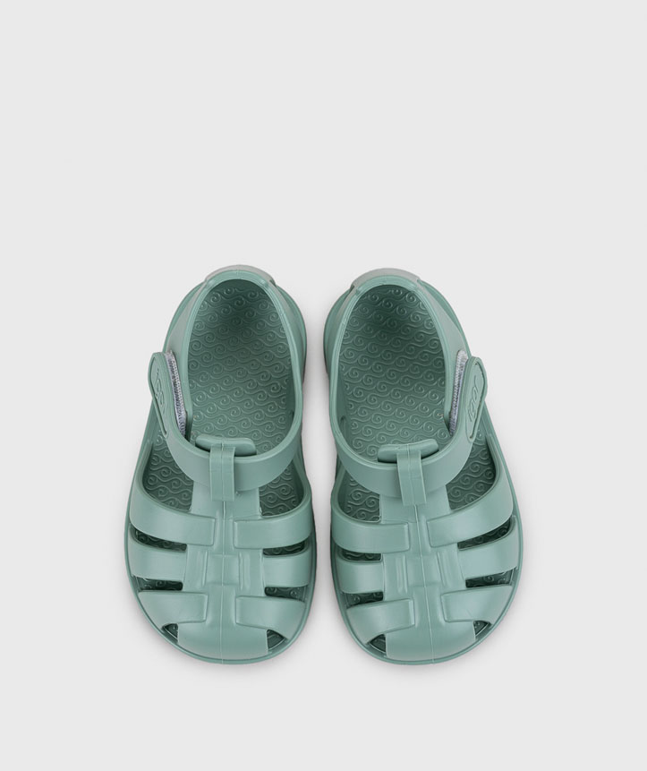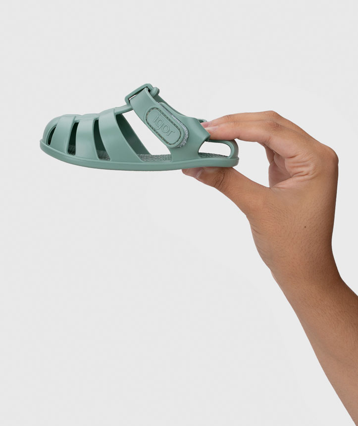 Fabricada com 50% de PVC reciclado e livre de ftalatos, esta sandália é uma opção sustentável e segura. A ponteira larga e ligeiramente quadrada oferece espaço suficiente para os dedos se moverem livremente, evitando compressões desnecessárias. O material impermeável e de secagem rápida faz com que seja ideal para a praia, piscina e dias de aventura ao ar livre.