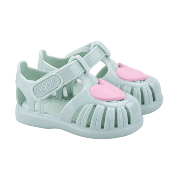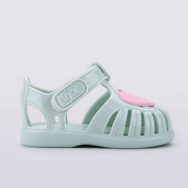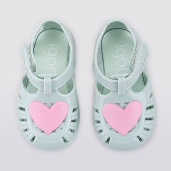 • Sandália infantil Igor verde água com detalhe rosa em coração e fecho em velcro.