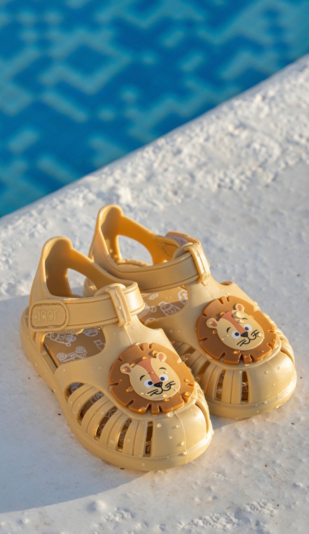 • Sandálias amarelas de criança com rosto de leão em relevo, junto a piscina.