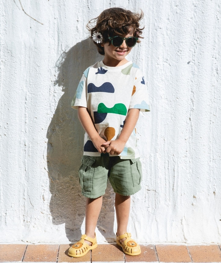 • Criança com t-shirt colorida, calções verdes e sandálias amarelas junto a uma parede branca