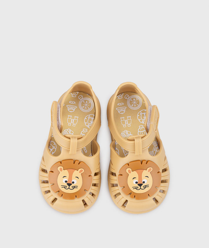 • Sandálias infantis em borracha bege com detalhes de leão e fecho de velcro.
