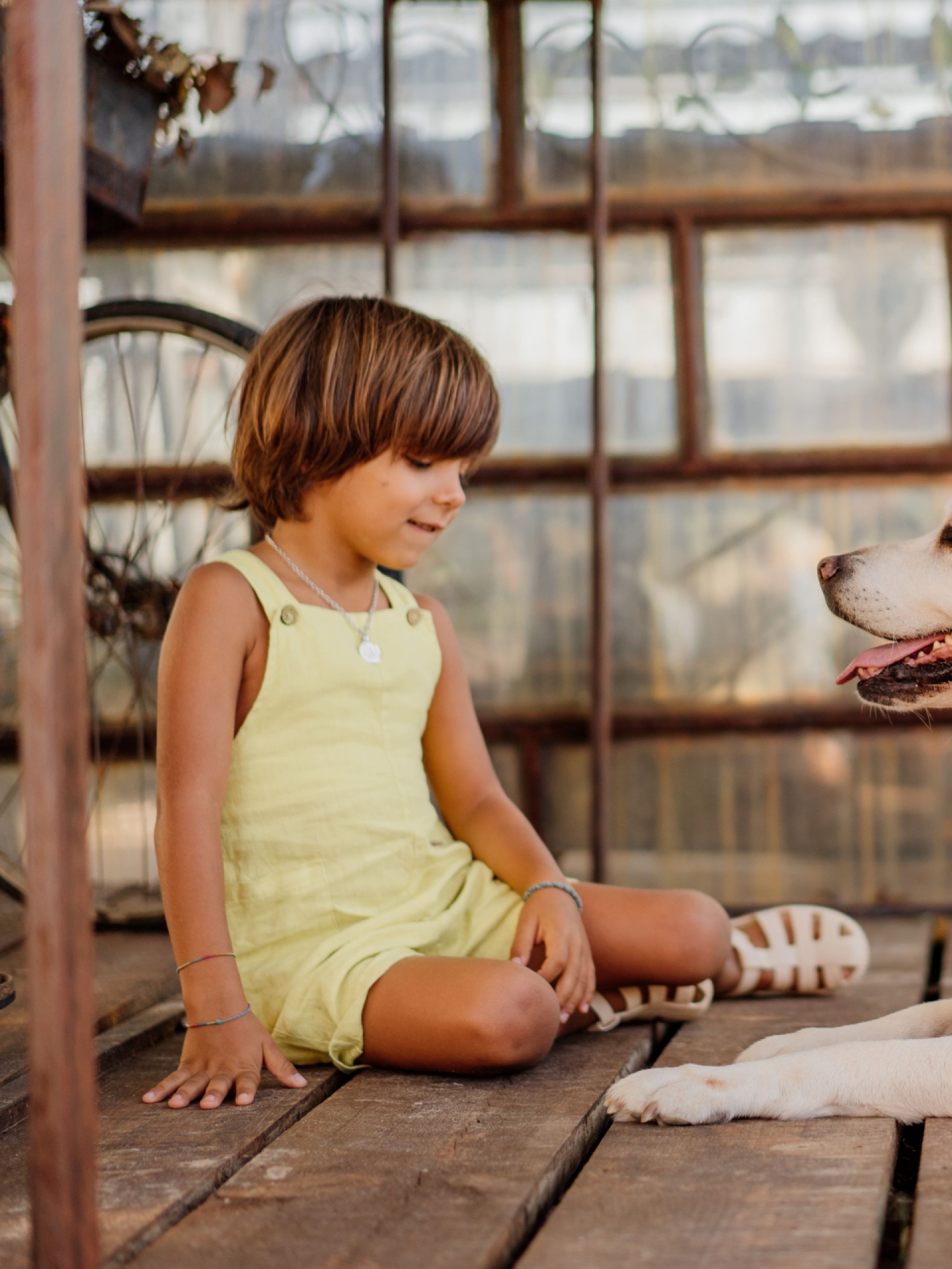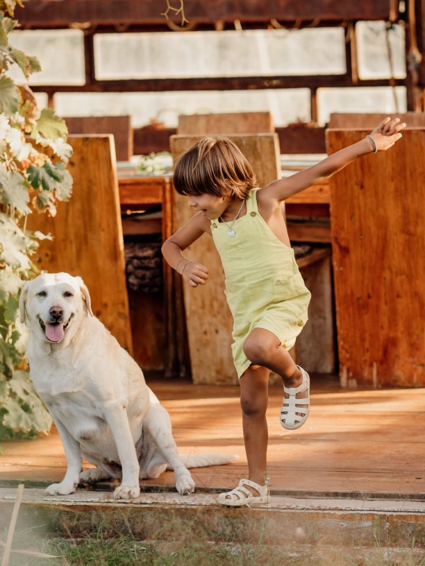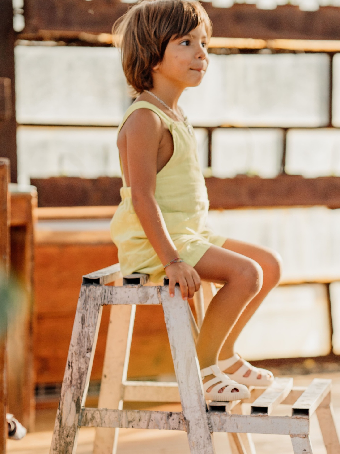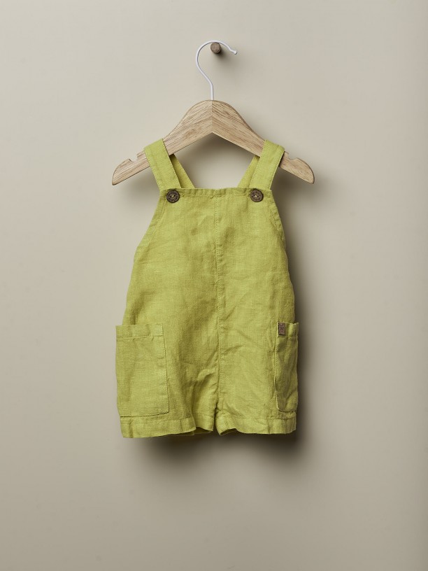Jardineiras curtas ideais para bebés meninos e meninas, até aos 4 anos. As jardineiras curtas FRIENDLY VIBE são produzidas em linho, forradas em algodão leve para maior conforto. Aperta nas alças com botões de côco.