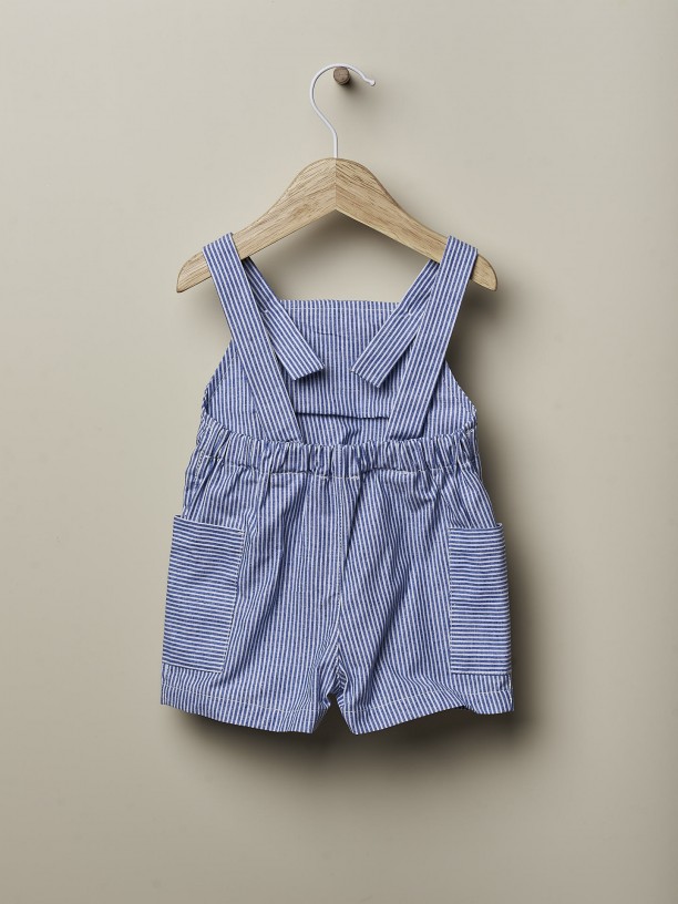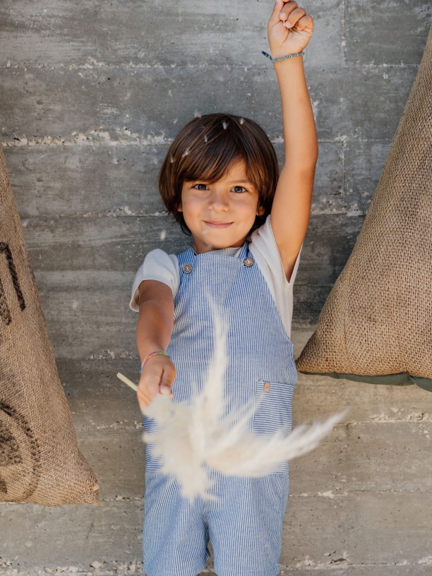 Jardineiras curtas Denim com riscas ideais para bebés meninos e meninas, até aos 4 anos. As jardineiras curtas NAVY são produzidas numa mistura suave de algodão orgânico, algodão reciclado e poliester reciclado, forrado em algodão leve para maior conforto. Aperta nas alças com botões de côco.