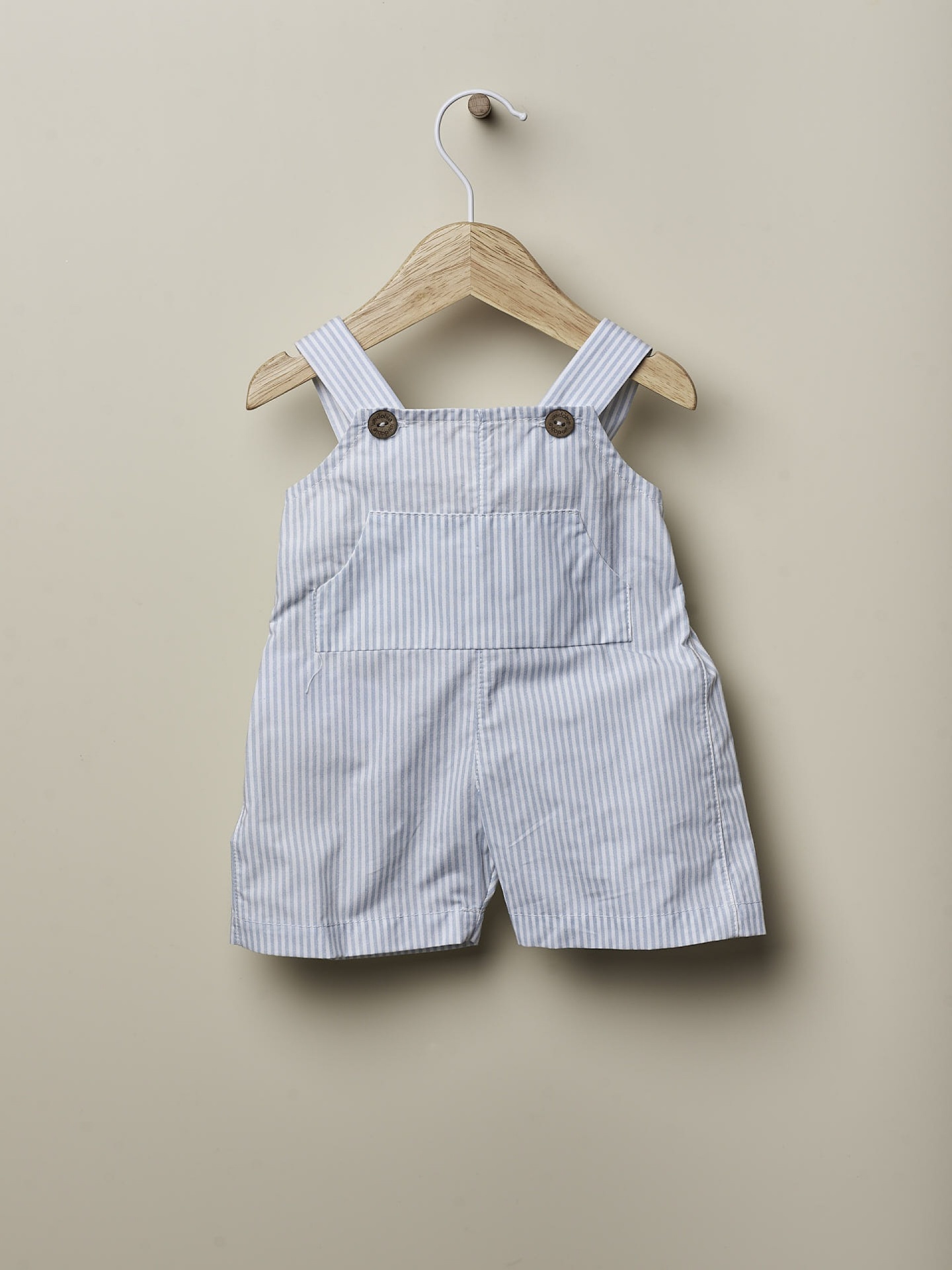 Jardineiras curtas estampadas com riscas suaves azuis e brancas | LITTLE LOVE