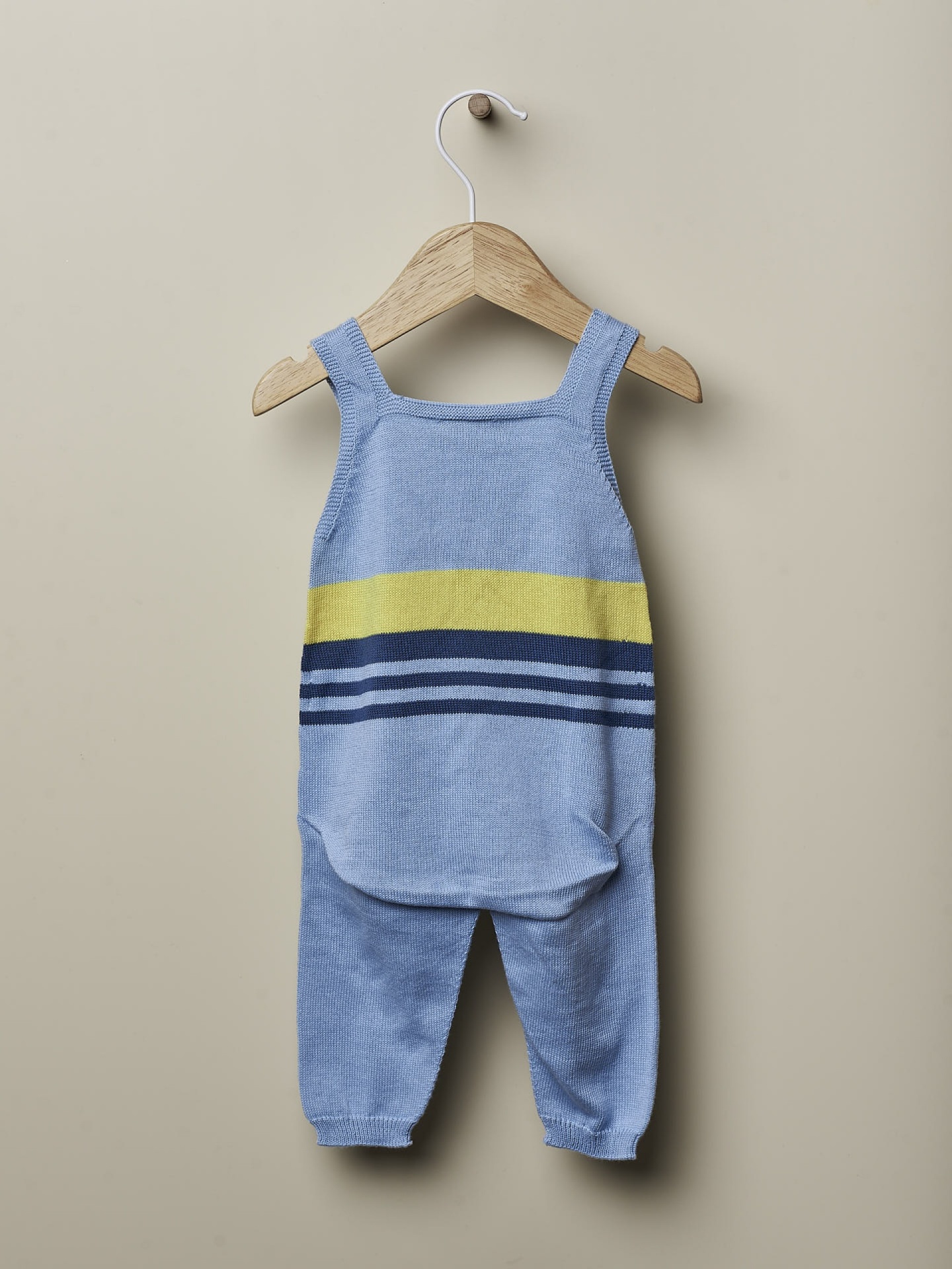 Jardineiras de alças tricotadas em malha de algodão, suave e respiráve. As jardineiras OCEAN apertam nas alças com botões de madeira. Produzido em Wholegarment, uma peça completa sem costuras, para maior conforto do seu bebé.