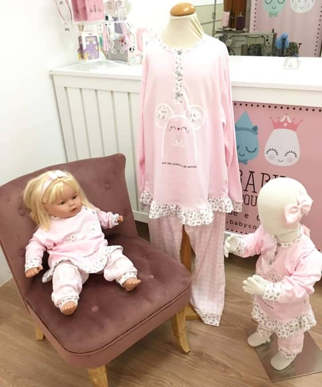 • Conjunto de pijamas rosa para adulto e bebé expostos em manequins e uma boneca sentada em cadeira