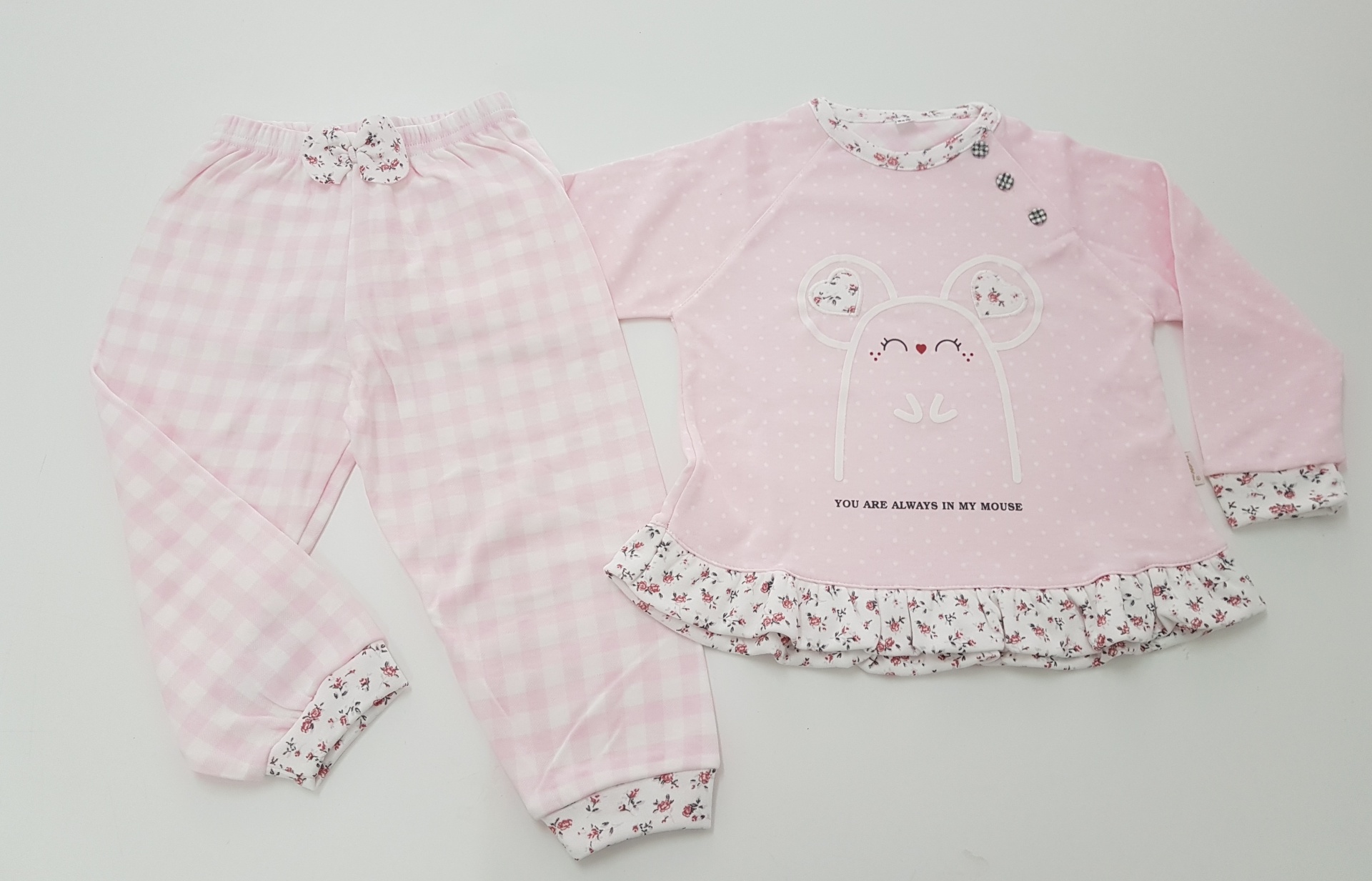 • conjunto de pijama rosa claro para bebé com estampa de rato e texto, padrão xadrez e floral