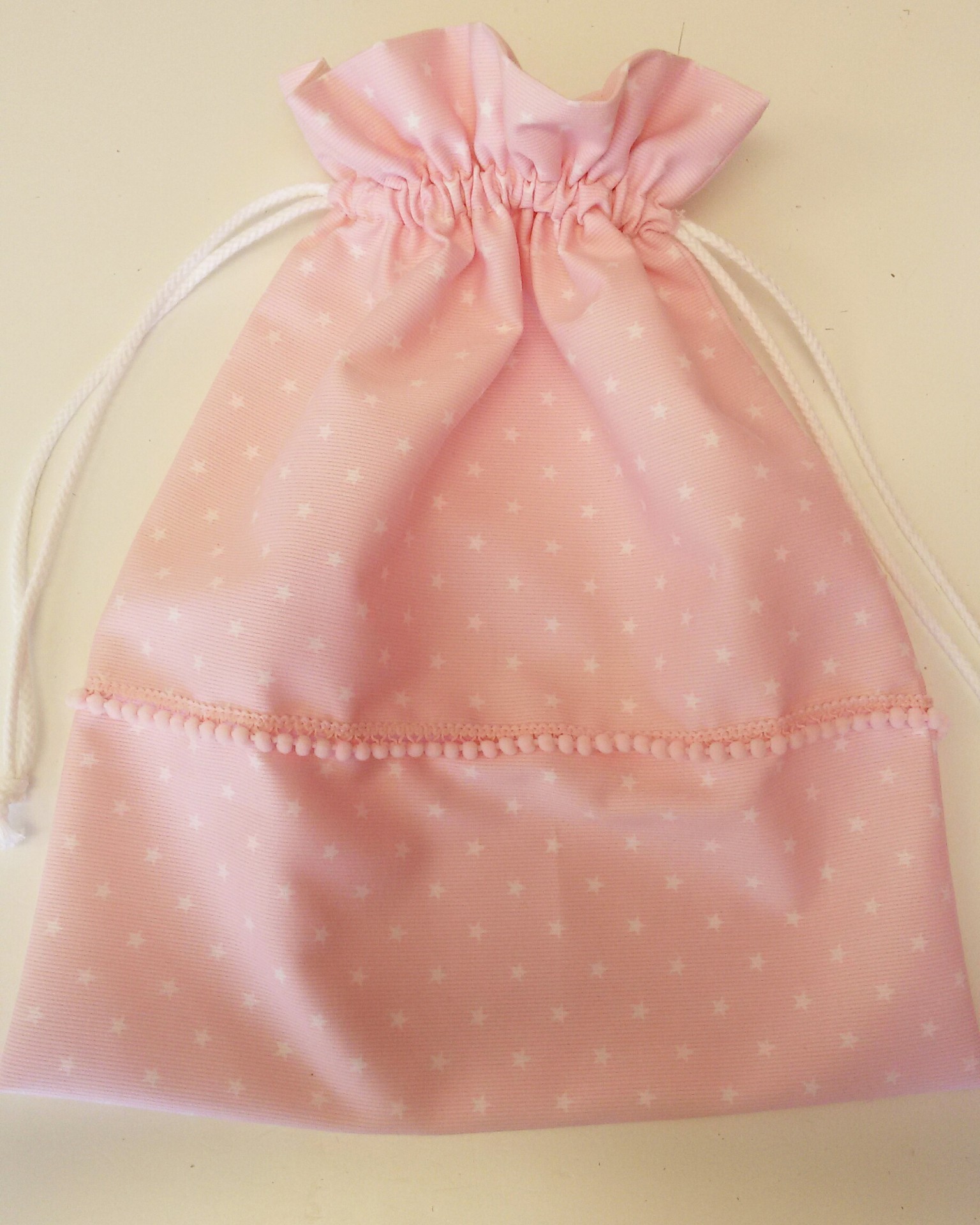 • Saco rosa com estrelas brancas e cordão de aperto