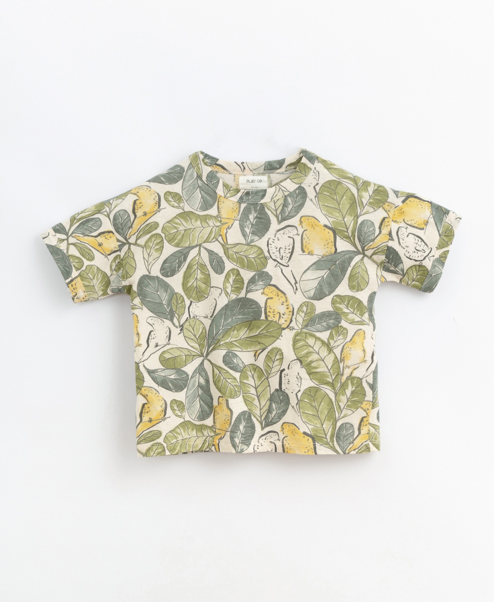 É um modelo com manga curta, tem decote redondo e o nosso estampado de periquitos.