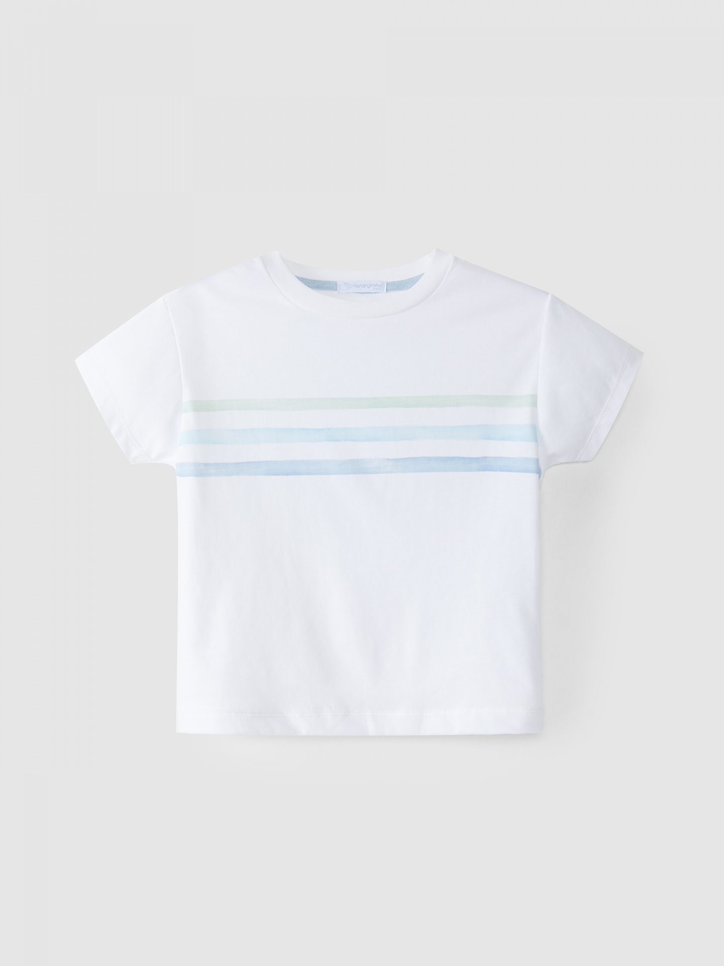 • T-shirt branca com riscas horizontais verdes e azuis
