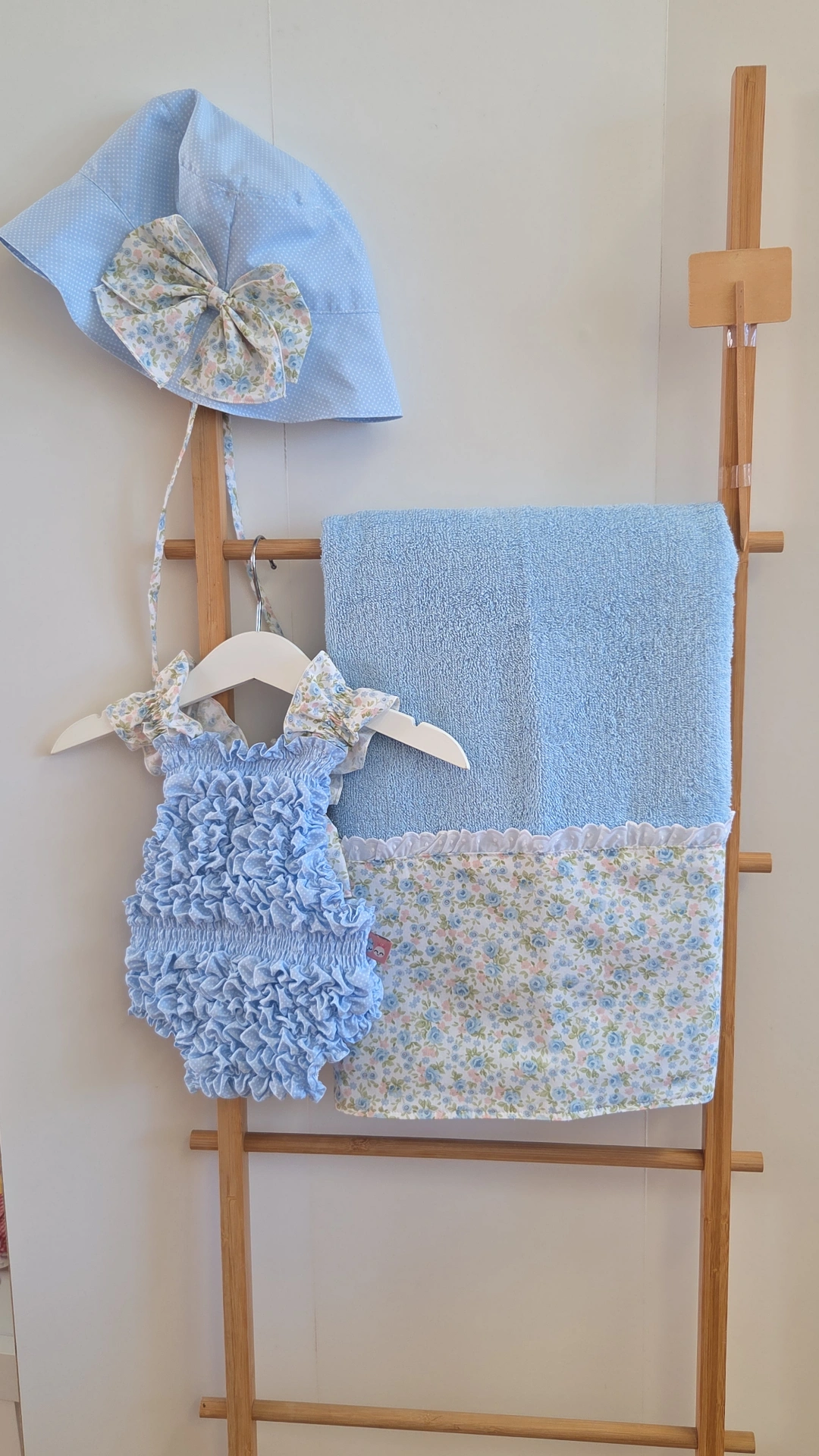 • Conjunto infantil azul claro com chapéu, body franzido e toalha com bordado floral pendurados numa estrutura de madeira.