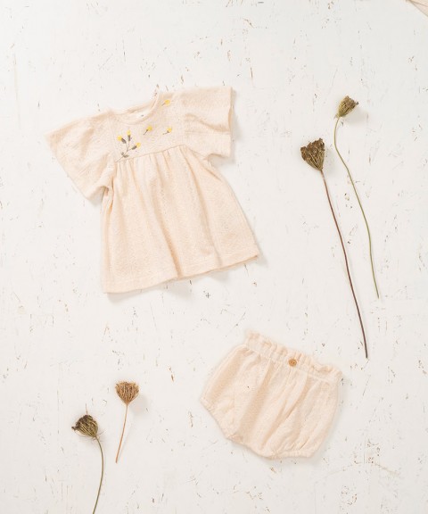 É um modelo com decote redondo, manga curta e larga, tem um bordado no peito e uma abertura nas costas com botões de madeira.