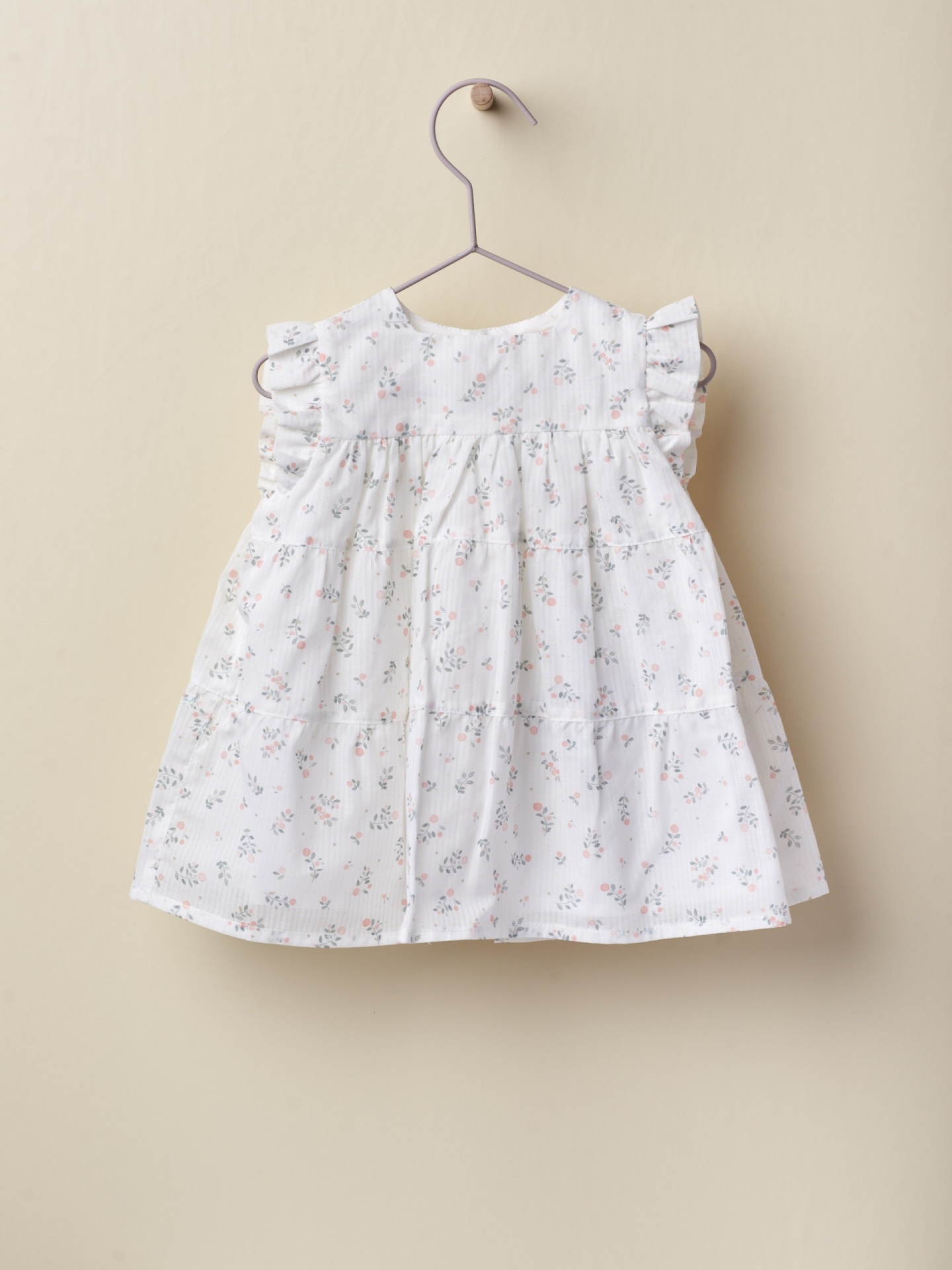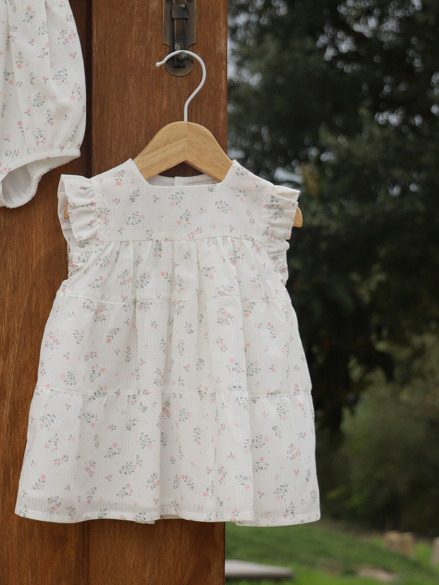 Vestido de bebé branco com padrão floral e mangas com folhos pendurado num cabide de madeira