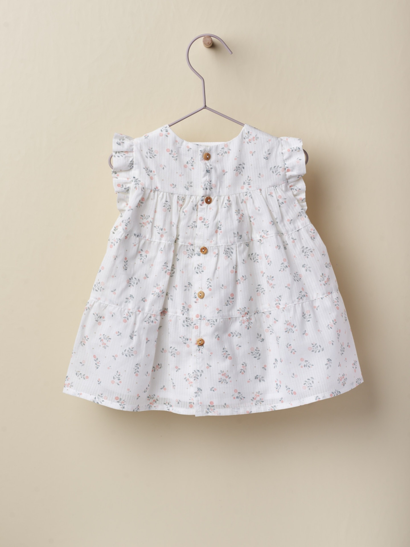 • Vestido branco para bebé com padrão floral, botões de madeira e folhos nas mangas