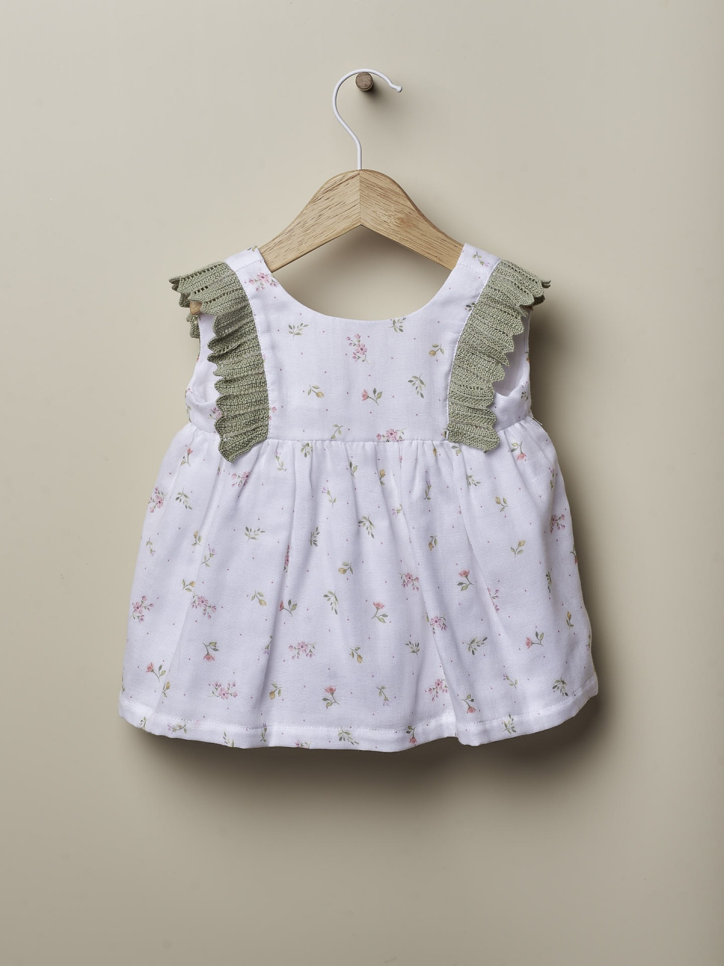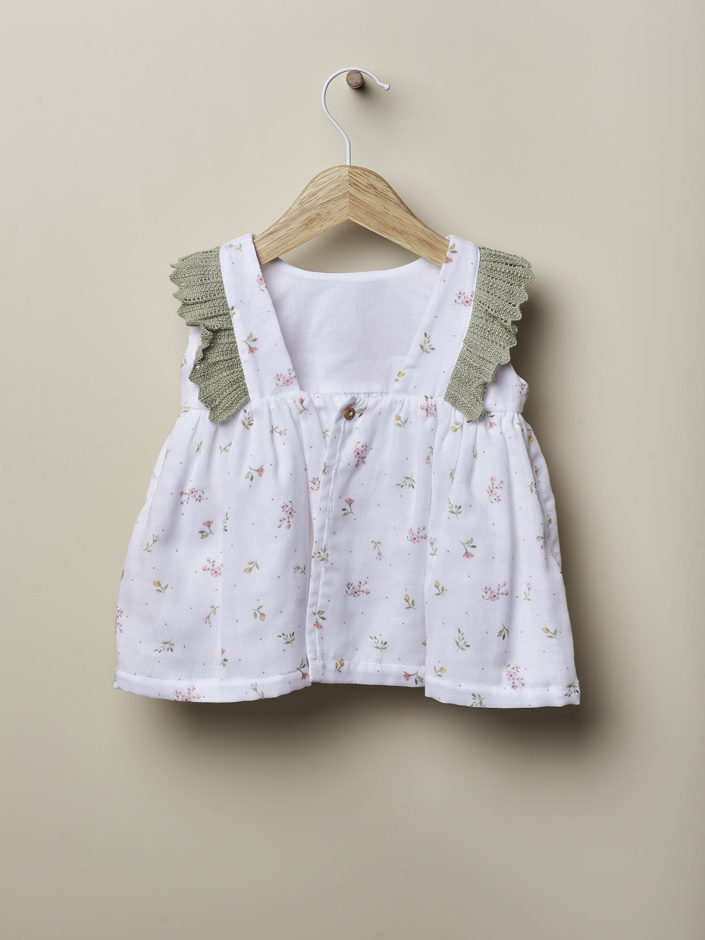 • Top de bebé branco com padrão floral e alças verdes de tricô
