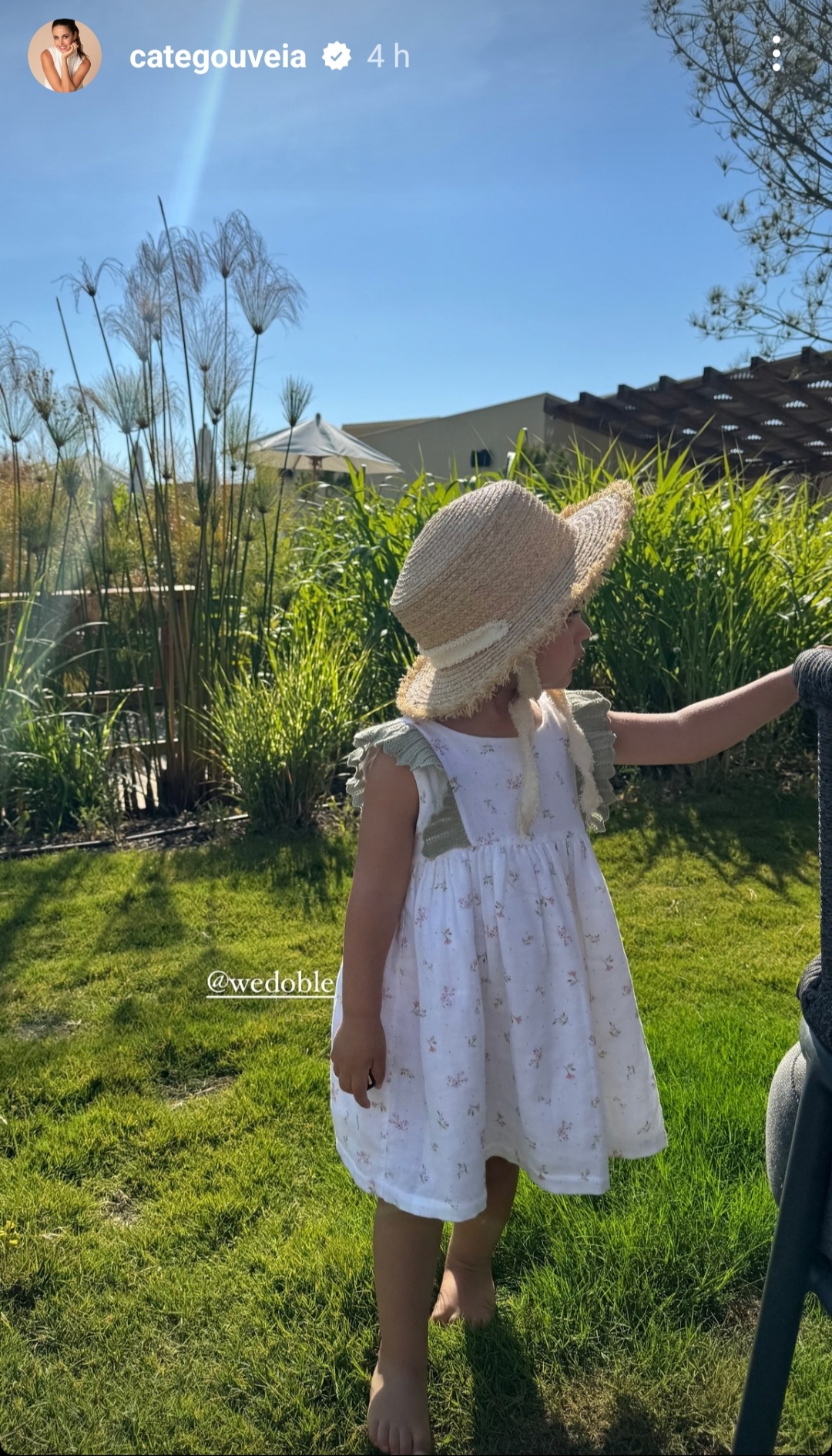 • Criança com vestido branco florido e chapéu de palha ao ar livre