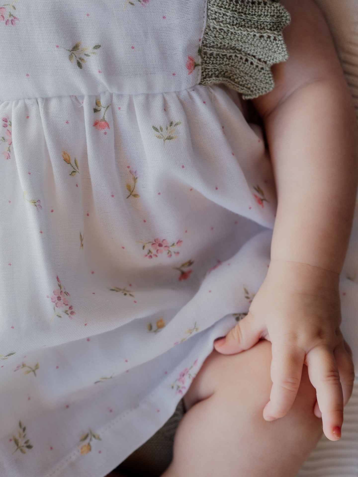 • Bebé a usar vestido branco com flores pequenas rosa e verde e manga de malha verde