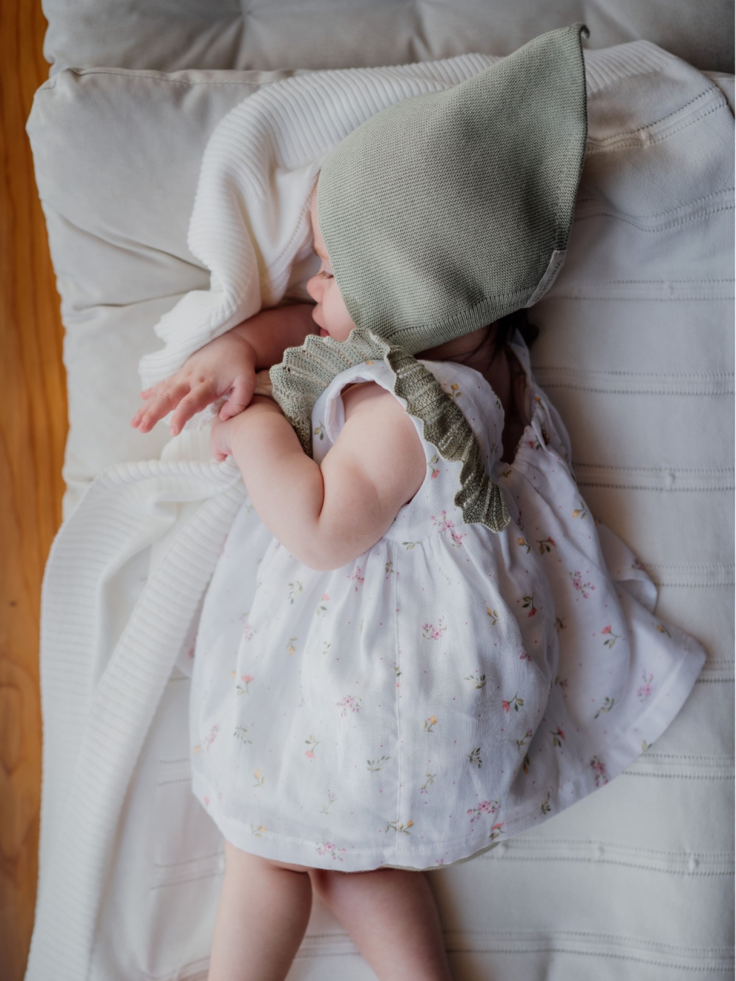 • Bebé deitada de lado com vestido branco floral e chapéu verde de malha