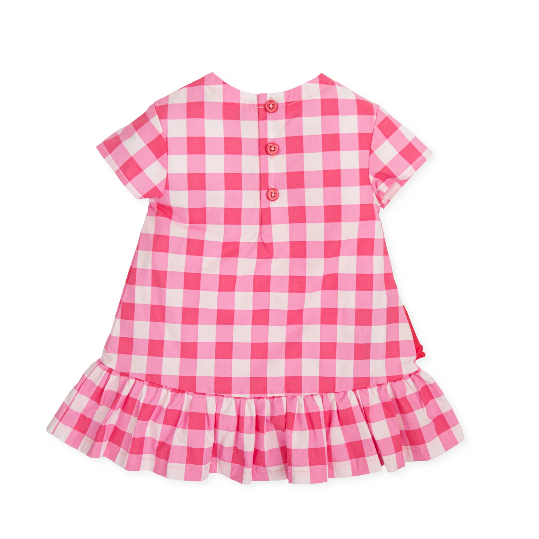 • Vestido infantil rosa xadrez com botões atrás e babados na bainha