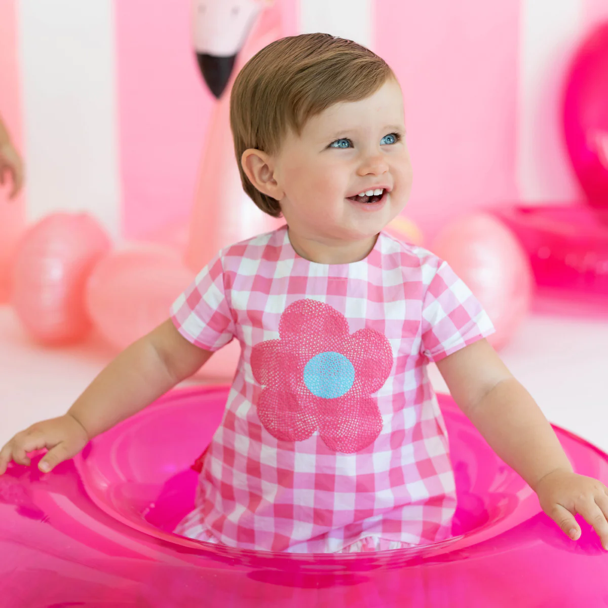 • Criança feliz com vestido xadrez rosa e boia inflável rosa em ambiente decorado com balões cor-de-rosa.