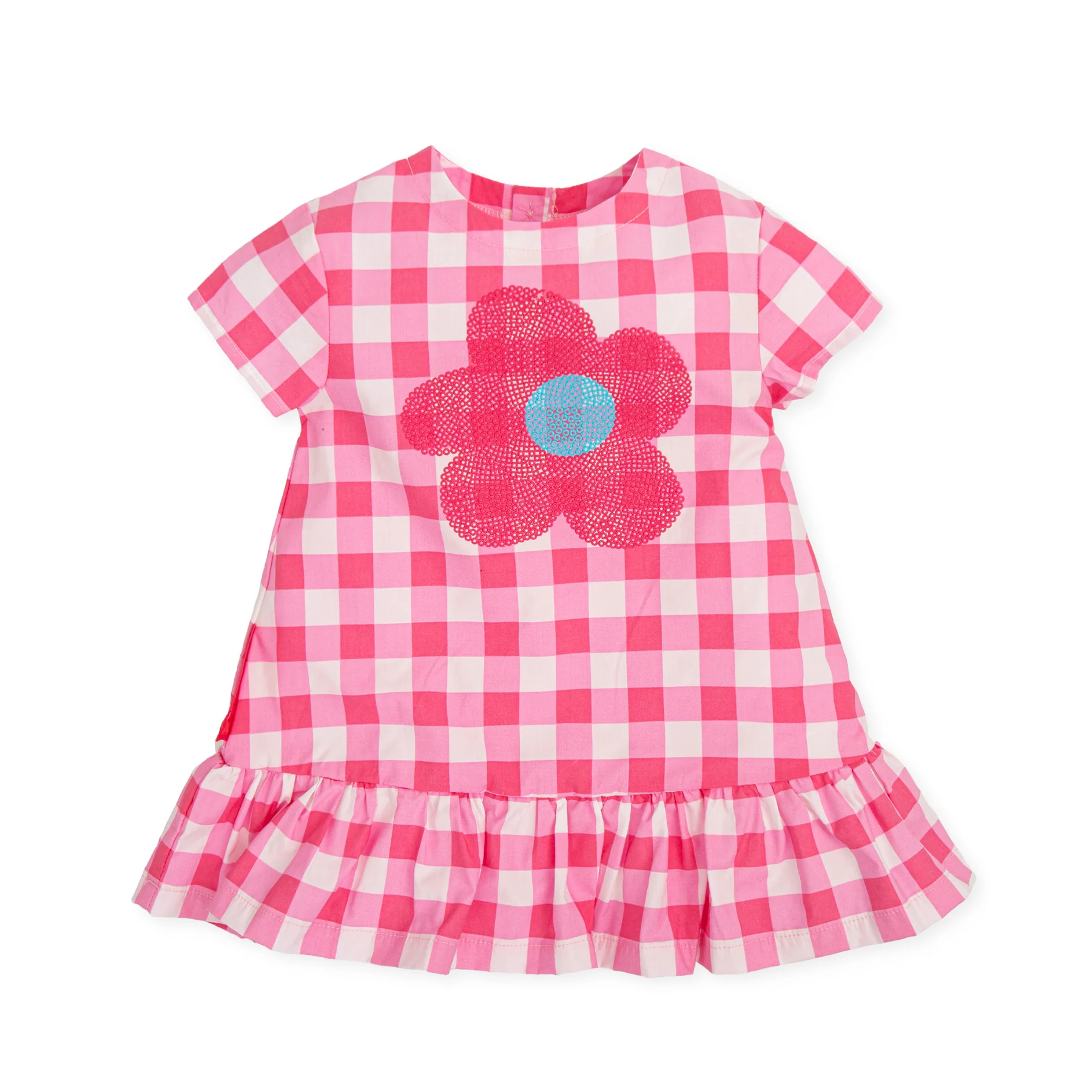 • Vestido infantil xadrez rosa com flor estampada